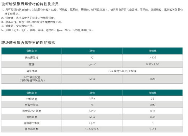 玻纖增強(qiáng)聚丙烯(FRPP)管,以聚丙烯為主要高分子原料,加入適量的增強(qiáng)材料,改性助劑和輔料;用獨(dú)特的工藝裝置,連續(xù)擠出成型,內(nèi)壁光滑,強(qiáng)度高,是一種外壁設(shè)有縱向加強(qiáng)筋與橫向加波相結(jié)合的新型埋地排水管,可輸送一般用途的水或腐蝕性液體。 FRPP管的性能指標(biāo):